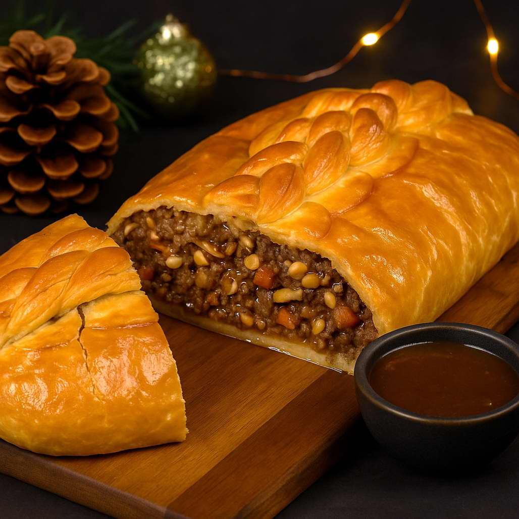 El hojaldre, ligero y crujiente, envuelve un relleno artesanal de carne magra 100% ternera, setas silvestres, queso y almendras, en una armonía de aromas y texturas. Se acompaña de su salsa trufada, puré de patatas artesano y guisantes salteados con jamón ibérico.